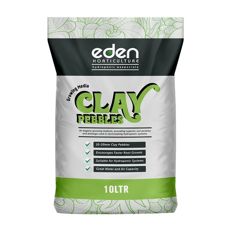 Eden Essentials Clay Pebbles As well as being used for drainage and aeration, Eden Essentials Clay Pebbles can also be used as a stand-alone growing media in hydroponic systems. Higher Nutrient Uptake Eden Essentials Clay Pebbles help your growing medium get more air and therefore encourage faster and stronger roots which can uptake more nutrients. KEY FEATURES 10-20 mm clay pebbles Encourages faster root growth Suitable for hydroponic systems. Great water and air capacity.