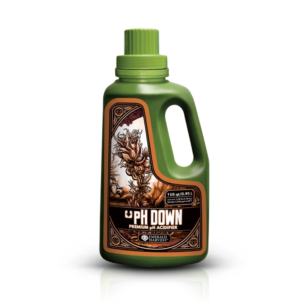Emerald Harvest pH Down pH Down is a straightforward solution for growing media and reservoirs that become too alkaline due to natural changes in the environment. Water that is too high in pH may prevent plants from accessing the nutrients normally available to them. Not only does this waste growers’ money, but it risks stunted growth, yellowing, and further danger of pests and diseases due to the plant’s vulnerability. pH Down corrects alkalinity levels with no disruption to plants or their surrounding micro-life. Fast, gentle correction The Emerald Harvest range is fully pH buffered and growers should rarely have problems with fluctuations if used correctly. However, should levels rise too high, a small amount of pH Down will restore the balance in seconds. No stress to plants A sudden influx of acid could be just as dangerous to a plant as a high pH. pH Down uses a weak acid to quickly but gently bring levels to their appropriate range. Unlike stronger solutions, it is friendly to the root system and carries no danger of stress to plants. How to use Emerald Harvest pH Down? Apply a very small amount at a time. Stir thoroughly and take a reading after each application until the nutrient solution reaches the required acidity level. For most hydroponically grown plants, the ideal pH range is between 5.5 and 6.5. Take extreme caution when using this product as it can cause severe skin burns and eye damage. It is recommended that users wear appropriate protective equipment such as gloves, an apron, splash goggles, and a vapor respirator. pH Down may also be corrosive to metals. Store in a cool, dry place out of direct sunlight. Where to use Emerald Harvest pH Down? Use in any growing media where the pH is too high (alkaline). Growers may identify this with a reading over 6.5, or by noticing dark spots, yellowing, curling, or leaf necrosis on plants. These may be signs of other common plant diseases, so it is always best to conduct a pH test before attempting to correct acidity levels. Mix into your usual nutrient solution and apply during your usual watering routine. Why choose Emerald Harvest pH Down? Premium pH acidifier; Corrects soil and hydroponic solution that is too alkaline; Restores pH balance in seconds; Low risk of stress to plants; Friendly to surrounding microbial life; Only a small amount needed. Product Specifications: Brand: Emerald Harvest Active Ingredient: Phosphoric Acid (40-45%) pH: 2