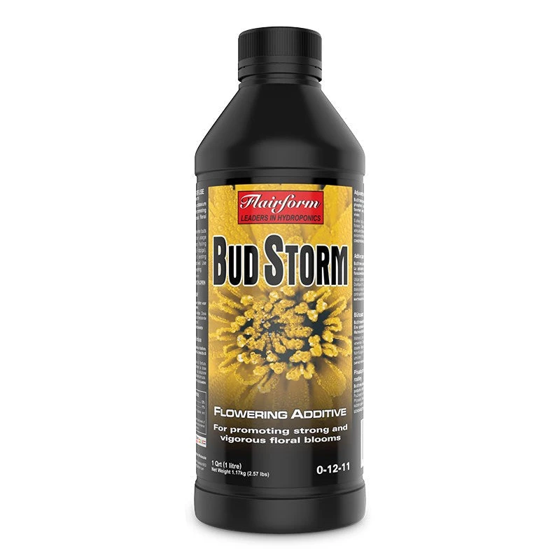 Flairform Bud Storm Developed to be used during the bloom phase, crops will be of optimum quality and size giving a bumper harvest. Flairform Bud Storm helps to give plants exactly what they need during flowering and is recommended to be used alongside the normal base feeding regime. For use in hydroponics, soil or coco. Use in conjunction with regular nutrition, throughout the flowering phase.
