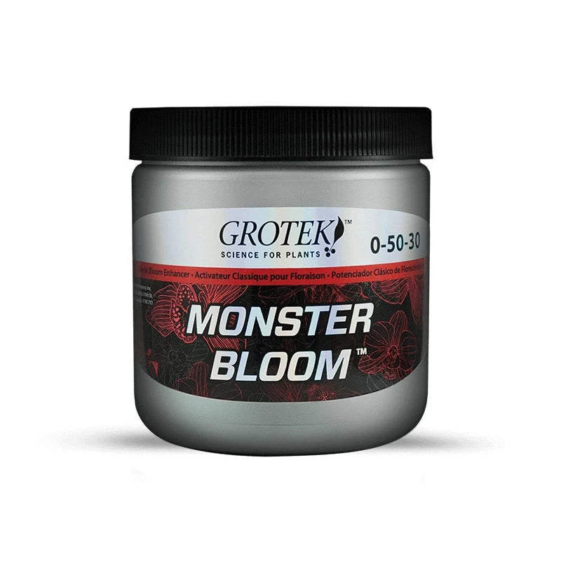 “Grotek Monster Bloom Grotek Monster Bloom has gained a reputation for its ability to assist plants during the middle stages of flower development and increase the overall harvest. The high concentration of phosphorous encourages blooming and plays a vital role in plant metabolism. Potassium in the formula improves bloom and fruit quality while impacting photosynthesis and assists starch production within the plant as well as facilitates ripening. KEY FEATURES Builds larger flower clusters Improves harvest yield Helps crops ripen Increases shelf life “