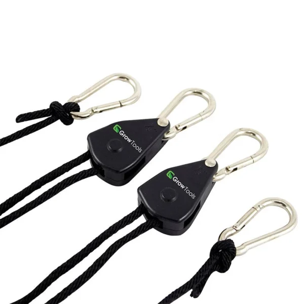 Grow Tools Rope Ratchets allow the easy hanging of grow room equipment. These super-strong rope ratchets hold up to 68kg of weight, making them perfect for hanging carbon filters, fans, ballasts, lights, reflectors and any other hydroponic equipment! The Rope Ratchets can also be altered without stretching or having to tie and untie knots. The user can simply hook them onto whatever needs to be hung and pull them tight and they will never break or slip. KEY FEATURES Simple and easy to use Pack of two Adjustable Lock in place and will never break or slip. Heat and cold resistant