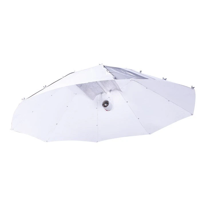 Ideal for providing maximum and even light coverage Omega Lighting’s range of Parabolic Reflectors are curved reflectors which makes them ideal for providing maximum and even light-coverage whilst avoiding unwanted hot spots. Omega Parabolic Reflectors are excellent for larger growing areas and covers a wide area from low mounting heights. Easy to assemble High-quality Provides maximum and even light-coverage 5 metre IEC Cable Wide-angled aluminium reflector How do the Omega Parabolic Reflectors work? Omega’s Parabolic Reflectors features a wide-angled parabolic shape that can be mounted closer to plants thus increasing light levels. The large umbrella-shaped reflectors are constructed from stucco galvanised reflective aluminium. The Parabolic Reflectors are 1 metre in diameter, with the Grow Lamp hanging vertically, which enables the light to cover a large area. Complete with 5 metres of cable and an IEC connection attached for easy connection to a suitable Ballast. Both Omega Parabolic Reflectors can be used with any HPS Lamp or Metal Halide Lamp. Why choose Omega’s Parabolic Reflectors? Omega Parabolic Reflectors have an incredibly even light spread and a design that produces low heat levels directly under the lamp. This means that it can be lowered further than is often possible when using conventional reflectors, without burning the tops of plants. The benefits of Omega Parabolic Reflectors is that by using high-quality materials compared to others on the market, the range of reflectors are long-lasting as well as delivering excellent results. With Omega’s Vertical Reflector, the Grow Lamp is mounted vertically so the majority of its output is directed towards the curved surfaces and reflected down towards the canopy. This method creates a more uniform spread of light than when using horizontally mounted lamps. This effect is beneficial as it helps eliminate hot-spots, which is an issue that occurs when light is too highly concentrated in a particular area. Omega Parabolic Reflectors also feature vents around the lamp holder to allow heat to escape through the top of the reflector. This, combined with the reflector’s open design, means that temperatures directly under the lamp are much lower than those under other reflectors, meaning that the Parabolic Reflectors can be positioned closer to the top of plants without causing burning.