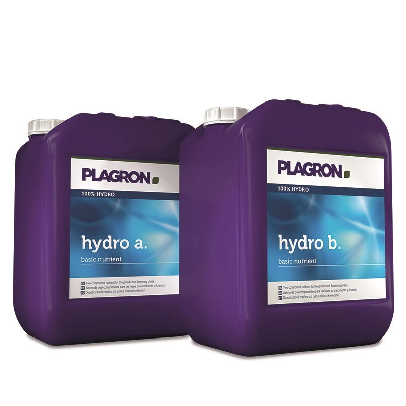Plagron Hydro A and Hydro B Plagron Hydro A and B is a highly concentrated mineral basic plant nutrition for use during the plant’s growth and flowering phase. It contains all trace elements in a quickly absorbable form. Hydro A Hydro A is rich in calcium which helps the plant against heat stress. Hydro B Hydro B contains magnesium which enhances the production of chlorophyll, making it an indispensable building material enabling the plant to grow. Hydro A&B complement each other resulting in a complete combination of nutrients. Hydro A&B can be used on all types of inert substrates. KEY FEATURES Complete control over the EC and pH values. Highly concentrated, so economical in use. No crystallisation in the nutrient tank.