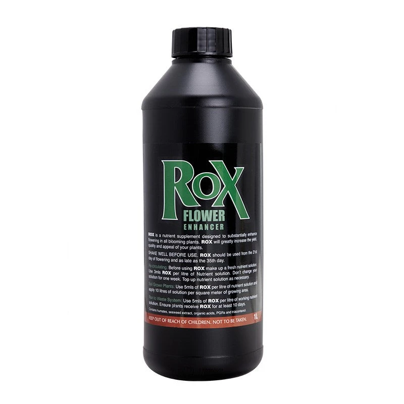 Rox Flower Enhancer (1L)Transform your hydroponic system in just two weeks with this super-strong bloom booster. Rox comprises both organic and synthetic ingredients, which combine to accelerate the growth cycle and speed plants’ metabolism. Powerful formulaRox contains a long list of ingredients, but each is specially chosen to aid plant growth in a slightly different way. Plants benefit from the vitamins, minerals, amino acids, humates, seaweed extract, plant growth hormones (PGRs), and triacontanol that make up each bottle of Rox. Humates, your new matesHumates are a form of organic matter, produced by the leftovers of carbon-rich plants that have been compressed over the ages. The humic acids present in humates help to regulate pH in soil and hydro systems. They also maximise the level of water and nutrients a plant can naturally hold. Humic acid promotes growth everywhere, but it is particularly useful for flowering plants: thickened cell walls in fruits and flowers makes for longer-lasting, longer-storing yields. Fast, economical resultsGrowers only need to use this bloom additive for two weeks, based on an 8-week hydroponic cycle – and no more than 5ml per litre is required. Consult our “How to use” heading below for advice on your chosen method. For those growing on a large scale, the difference is astounding. Enjoy faster results, larger yields, and plants that are stronger from the inside out…and you’ll still have plenty of Rox for next time. Where to use Rox Flower Enhancer?Rox is specially formulated for flowering plants in hydroponic systems. The solution may also be used for soil growth. When to use Rox Flower Enhancer?Rox should be used during the 4th and 5th weeks of the flowering period (based on an 8-week growth schedule). Lengthen or shorten this period as necessary, depending on the cycle length of the flowers you are growing. How to use Rox Flower Enhancer?The regimen below is based on flowering plants with a cycle of 8 weeks. Users may need to adjust the timing for plants with a longer or shorter blooming period:For an 8-week cycle, use Rox during the 4th and 5th weeks. Shake the bottle well and add Rox to your nutrient solution in the following quantities: 3ml per litre of water for a re-circulating system; 4ml per litre of water for soil growing. Use 10 litres of diluted solution per square metre of growing space; 5ml per litre in run-to-waste systems. Rox is a bloom additive rather than a plant food, so please continue your usual feeding routine alongside this. Only ever do so once the nutrients are diluted in water: they should never be mixed in concentrated form. This can cause a chemical reaction, and may cause damage or void the effects of the nutrients. Why choose Rox Flower Enhancer? Extremely potent flowering booster; Triggers weight gain in fruits and flowers; Contains plant growth hormones (PGRs) and triacontanol for rapid effects; Speeds plant metabolism; Lengthens and strengthens roots; Highly concentrated and powerful; For hydro and soil; Only requires 2 weeks’ usage. Product Specifications: Brand: Rox Capacity: 1L Active Ingredients: Organic acids, humates, seaweed extract, plant growth hormones (PGRs), triacontanol. For Use In: Hydro, Soil