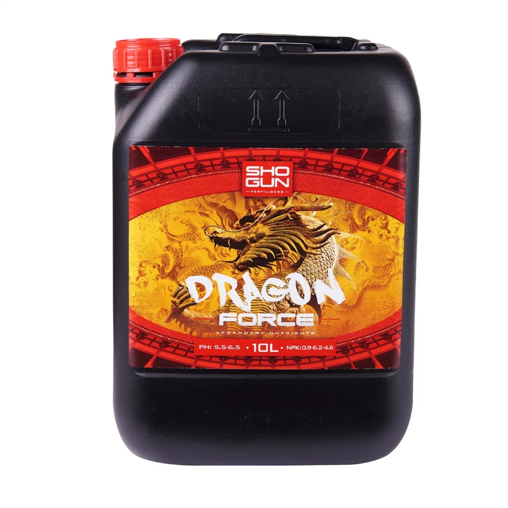 SHOGUN Dragon ForceThis fiery formula is the answer to huge yields. Usually, growth slows down in the final 2 weeks of flowering, but Dragon Force pushes it until the very end.Growers will see larger, more highly scented fruits and flowers. There’s also an increase in essential oils thanks to its high sulphur content. Accelerates maturing processPlants store energy (in the form of sugars, nutrients, and carbohydrates) as an emergency reserve. As they approach the end of their life, it’s likely that they won’t need them – and so they potentially go to waste.SHOGUN Dragon Force uses these saved-up resources for one huge growth spurt at the end of flowering. It re-mobilises carbohydrates from the roots to the flowers. Since carbohydrates are an integral energy source, this sudden influx causes a dramatic increase in plant metabolism and huge growth in the flowering zones. It also moves calcium towards the fruits and flowers, improving their cell wall structure and increasing shelf life. Replaces PK boosterDragon Force supplements essential phosphorus and potassium – so there’s no need for your PK booster while you use this. You’ll see growth like never before with just one product. It delivers P and K in the ratios 9.5 – 6.9. This is higher than many standard bloom boosters! This nutrient-rich solution provides enough to facilitate the complex translocations taking place, with plenty of energy left over.Magnesium and sulphurMagnesium and sulphur are also at hand in this powerful blend. Magnesium is essential for chlorophyll production, meaning it’s key for photosynthesis. Plants rich in magnesium will experience greater amounts of chlorophyll – meaning plants will be greener and more advanced in their growth.Sulphur is a secondary macronutrient found in several different amino acids. You might know these as the “building blocks” for proteins. So, sulphur helps determine the rate of protein synthesis and consequently the rate at which a plant receives energy. Sulphur is also considered to increase essential oil production, making for more highly scented fruits and flowers. How to use SHOGUN Dragon Force?Dragon Force is a nutrient solution to be reckoned with! It produces an impressive finish in any substrate, including soil, coco, and hydro. For all growing media: Dilute at a rate of 4ml/L and mix thoroughly. Add to your nutrient reservoir, hydroponic tank, or watering can. Use for the final 2 weeks of flowering in place of your normal bloom nutrient and PK supplement (such as SHOGUN PK Warrior). You may continue to use SHOGUN Sumo Boost if doing so. Why choose SHOGUN Dragon Force? Accelerates growth at the end of life; Produces huge, vibrant fruits and flowers; Replaces bloom nutrients and PK additives; Uses magnesium to drive photosynthesis; Increases secondary metabolite production; Apply in the final 2 weeks of flowering. Product Specifications: Brand: SHOGUN NPK Ratio: 0 – 9.5 – 6.9 Other Active Ingredients: Magnesium (2.6%), Sulphur (2.5%).