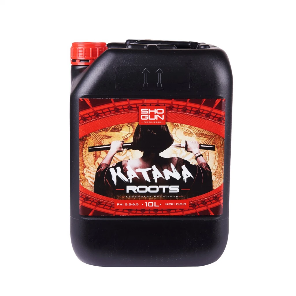 SHOGUN Katana Roots See roots in as little as 5 days. Katana Roots stimulates root initiation and elongation, using boron to encourage development well before the natural point. Your plants will form longer, thicker, more complex networks. Nutrient uptake will be through the roof – leading to prime defence systems and less chance of root disease. Seaweed-based biostimulant Katana Roots is a biostimulant: it is not a nutrient solution and is therefore impossible to overfeed. Instead, it contains seaweed which is full of beneficial hormones such as auxins and biotins. Many seaweed products use a harsh acid or alkali to extract these hormones. However, Katana Roots is produced using a cold-pressing method to prevent denaturing vital components such as vitamin B12. Speeds up propagation The auxins and boron in Katana Roots work together to prompt root initiation and encourage germination in seedlings as young as 5 days. Biotin increases root thickness, allowing optimum nutrient uptake in this critical period. Relaxed, resistant plants B vitamins and amino acids help regulate the hormonal balance in stressed plants. And guess what – Katana Roots is full of them! Recently cut plants or plants exposed to stressful conditions (such as high temperature) will likely become stressed. With Katana Roots, they’re able to calm down on a chemical level. Happier plants are healthier overall, so you’ll witness more effective nutrient uptake and a garden that’s more resistant to root diseases. Highly versatile There’s no need for a stack of products when you have Katana Roots. It works in all growing media including soil, hydro, and coco. Along with its high concentration, it’s a convenient and cost-effective product to keep at hand. Growers may use the solution as a cube soak to encourage germination in cuttings or younger plants. Propagation cubes, such as rockwool cubes, are highly aerated and leave room for your impressive new root network to grow. Alternatively, it can be diluted in the quantities stated and applied as a foliar spray. This method directly targets leaves, which might seem counterproductive for a root solution! However, foliar absorption may be useful in warmer months when the root system is less effective and the plant has a full set of leaves. How to use SHOGUN Katana Roots? Katana Roots uses an equal dilution rate for any growing medium and in hard or soft water. They’ve done all the brainwork for you! It’s suitable for all growing phases, including with cuttings and seedlings and through the vegetative and flowering stages. This is based on a 2-week germination/propagation stage, a 4-week vegetative period, and a 9-week flowering period. You may add extra flowering weeks between weeks 4 and 5 if necessary. Mix in the following quantities and add to your hydroponic tank, feeding system, or watering can: CUTTINGS AND SEEDLINGS Weeks 1-2: 5ml/L. VEGETATION Weeks 1-4: 0.2ml/L. FLOWERING Weeks 1-3: 0.2ml/L Weeks 4-8: Do not use Katana Roots during this period. Final Week: Water only during this week. Since Katana Roots is a biostimulant rather than a nutrient solution, you may wish to supplement nutrients alongside use. SHOGUN Start perfectly complements the chemical makeup of Katana Roots. Never add multiple nutrients or additives at the same time. Always dilute and stir thoroughly before adding another. Why choose SHOGUN Katana Roots? Seaweed-based biostimulant; Forms longer, more complex root network; Roots appear earlier; Suitable for any growth period; Natural cold-pressed extraction method; Helps maintain hormonal balance; Can be used as an additive, cube soak, or foliar spray; Reduces stress in cuttings and seedlings. Product Specifications: Brand: SHOGUN
